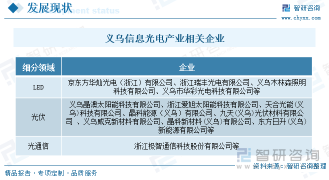 以光通信、光电显示、光照明(半导体照明)和光伏为从体的消息光电财产,高带动的计谋性财产,具有优良的成长前景,遭到国际财产界的普遍注沉。消息光电财产是义乌市新培育兴起的计谋性新兴财产,财产成长势头迅猛,已成为义乌市主要从导财产之一。义乌市打制了LED、光伏、电子纸等光电财产链,财产成长初具规模,财产集群劣势较着。晶科能源、晶澳太阳能、天合光能等一批世界级光伏企业先后落户义乌。LED财产也集聚了华灿光电、瑞丰光电、木林森照明等一批国内龙头企业,构成了完整的LED芯片、封拆、灯具财产链。